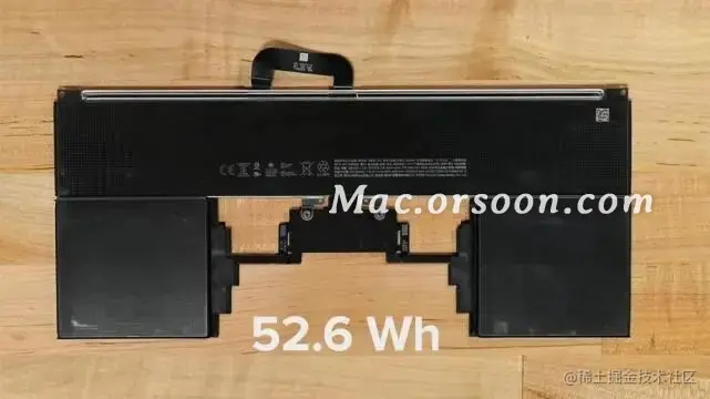 至于电池也采用拉伸释放粘合剂固定在外壳上,在更换电池可以将每条胶带拉出来,相对比起使用螺丝固定会更好,M2 MacBook Air 电池是采用 52.6 Wh,顶部两节并连、底部两节串连,就像是三节电池串在一起运作。