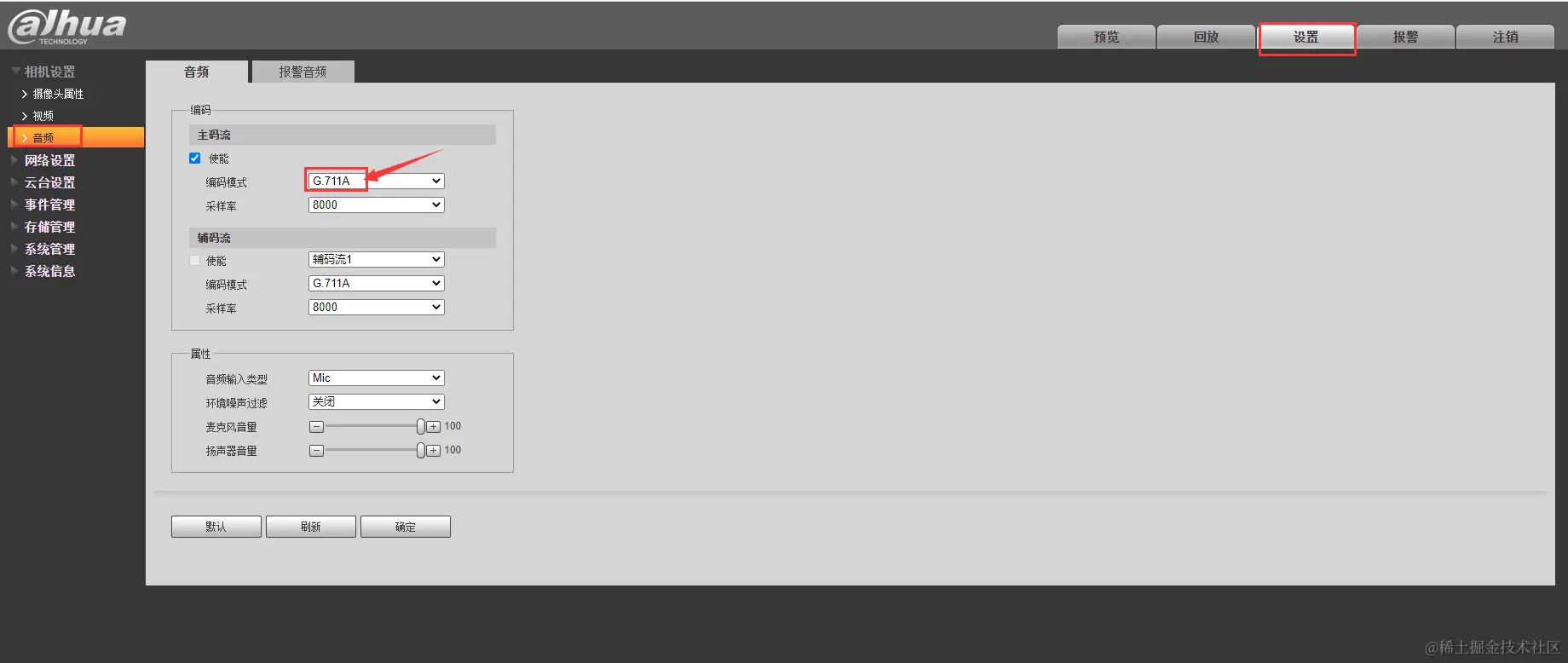 根据以上步骤做出配置后,仍有可能会出现没有声音的情况。若出现这种情况是和摄像机的音频设置有关。