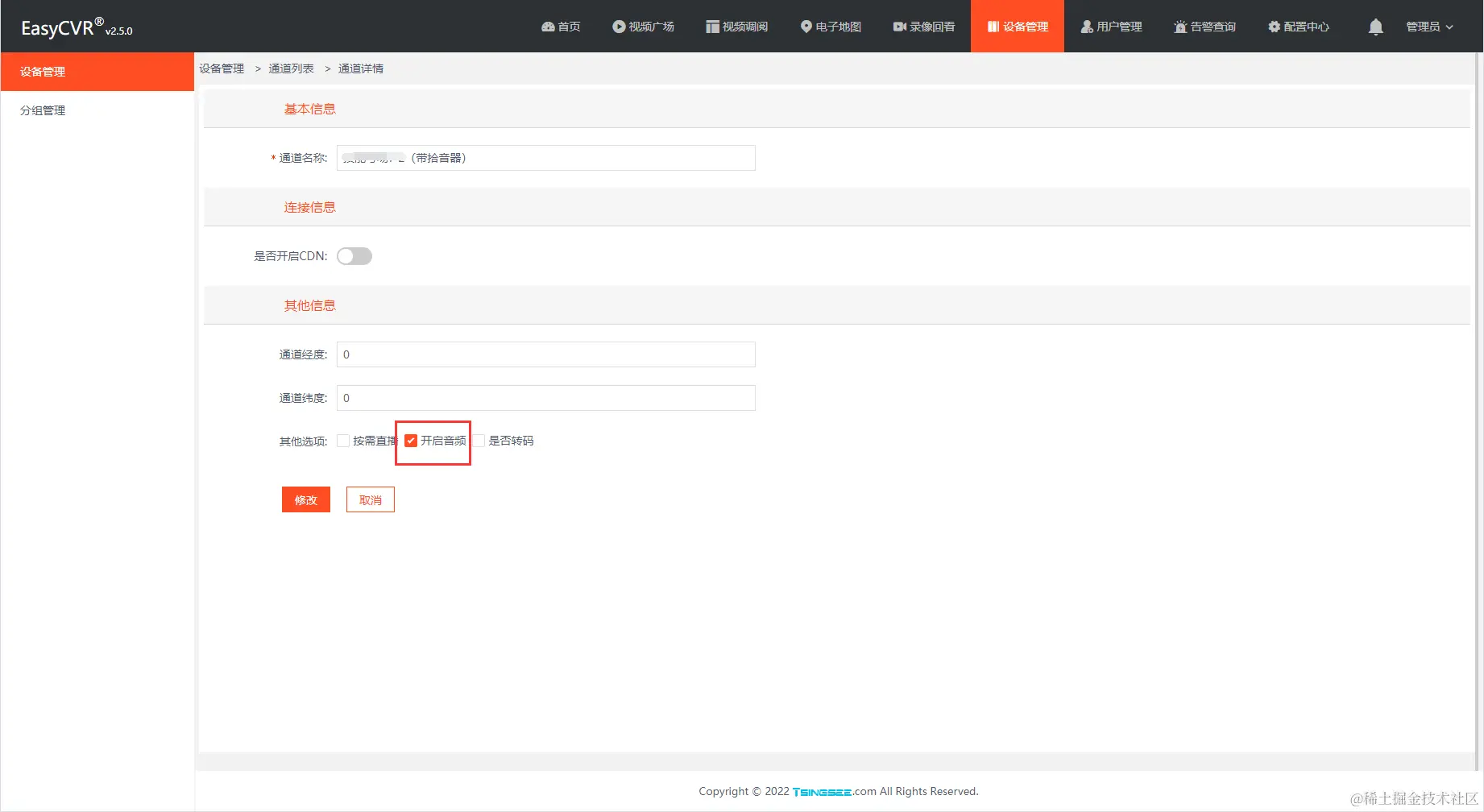 首先,需要支持音频采集的摄像机提供音频传输,然后在设备的通道列表找到对应的通道,点击编辑,勾选开启音频选项,点击修改按钮进行保存。