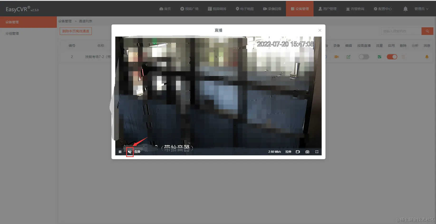最后,在通道列表或者视频广场页面打开该通道的视频,点击左下角喇叭的图标,开启音频,即可听到设备端传输过来的声音。