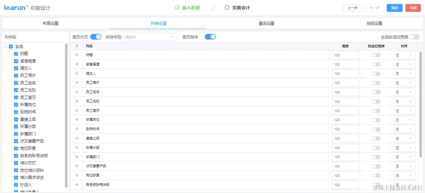 在[列表设置]配置主界面的列表展示的数据列,以及是否倒序、是否启用分页数据的展示。
