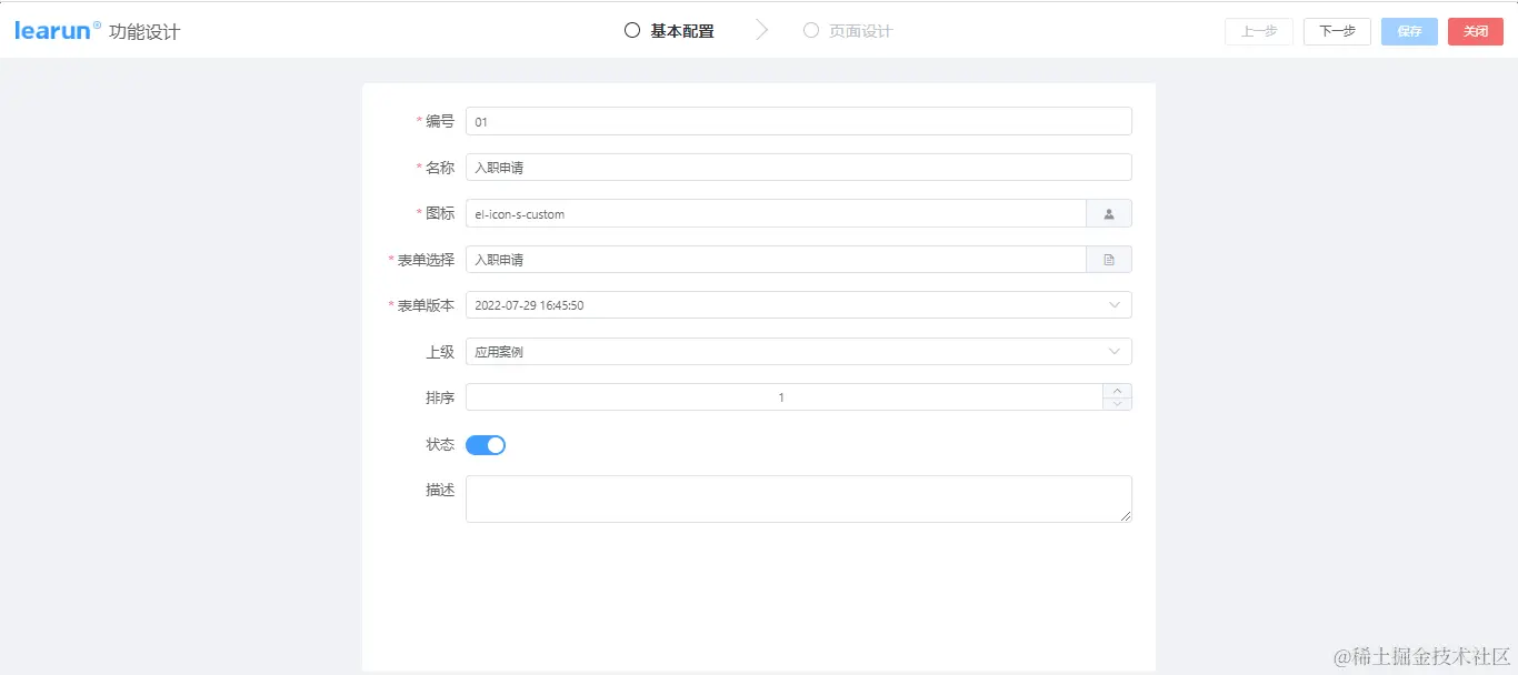 按照提示填写编号、名称、图标、表单版本、表单选择、上级等基本信息配置。