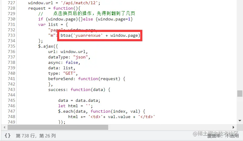 猿人学12-入门级js Botton 2022-08-01 76 阅读1分钟 本文已参与「新人创作礼」活动,一起开启掘金创作之路。 目标:m 在堆栈这查看request 跟进去发现m btoa()方法,也就是将字符串进行base64编码 window.page就是当前页数