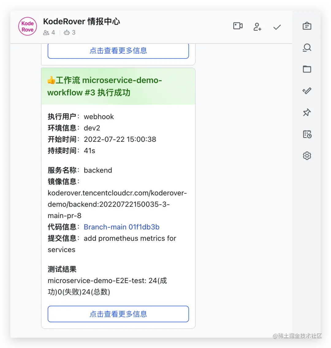 待工作流执行结束,会自动将结果发送到 IM 系统中,对于失败的情况对应工程师可及时跟进排查,对于成功的情况可及时通知相关同学完成代码 review 以及合并事项,快速集成。