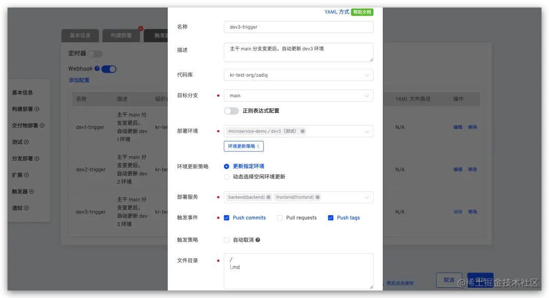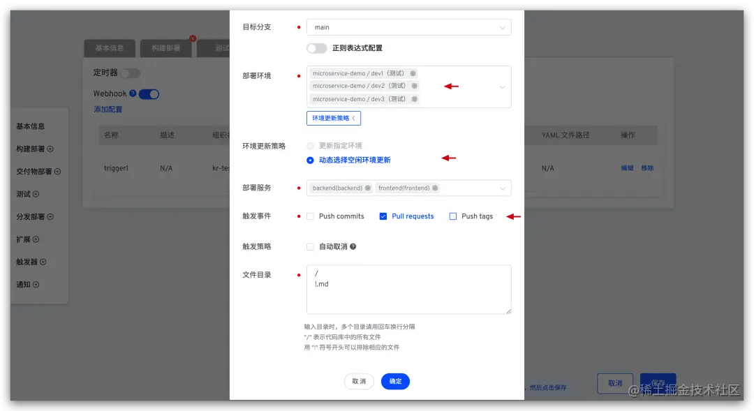 编辑工作流 microservice-demo-workflow-main,配置多个 Webhook 触发器,用于确保所有环境时刻和主干分支一致。