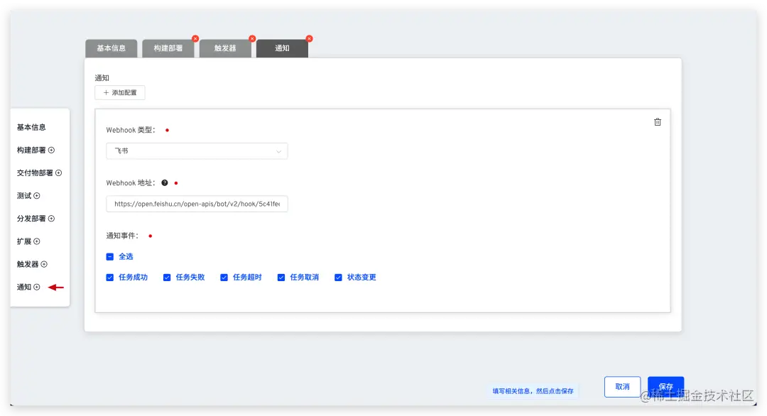 编辑工作流 microservice-demo-workflow-dev**,添加通知配置,以飞书示例如下。**