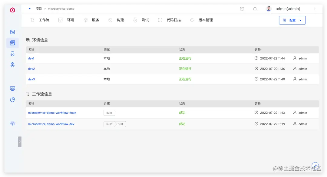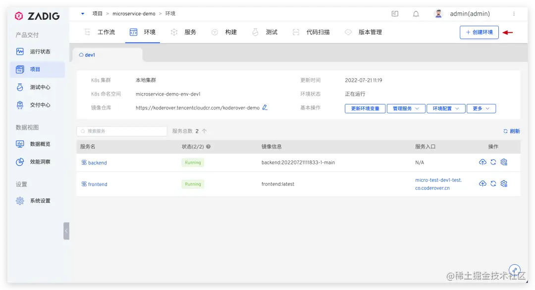 进入 microservice-demo 项目,点击+创建环境创建多套同构环境,环境数量可根据团队人员配置情况决策。