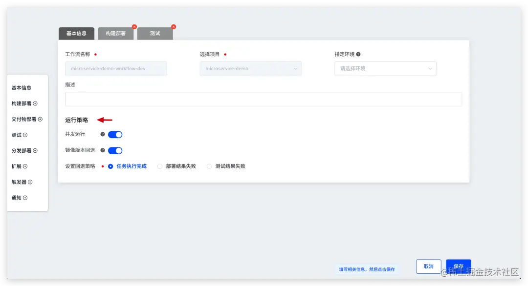修改工作流 microservice-demo-workflow-dev,开启运行策略中的并发运行和镜像版本回退,回退策略选择任务执行完成。