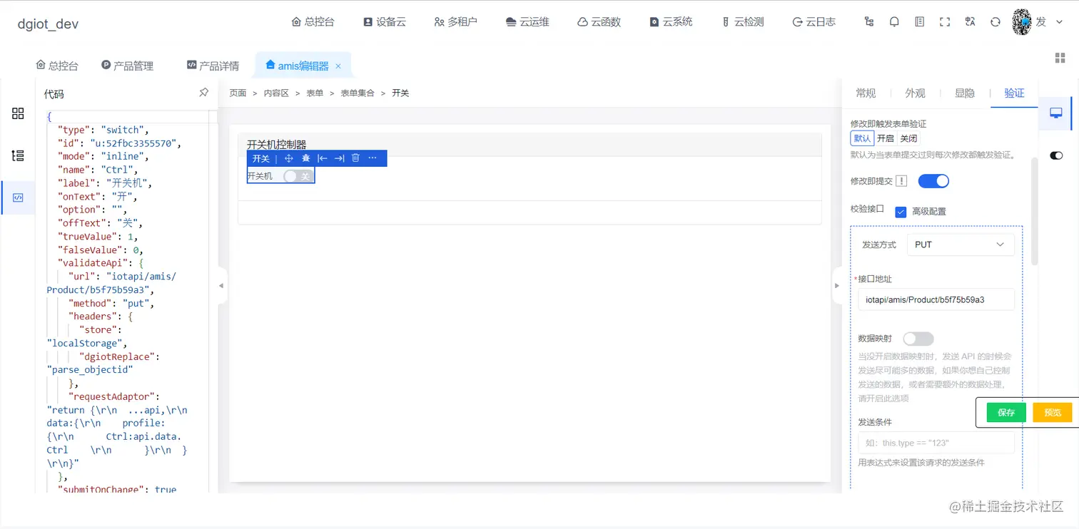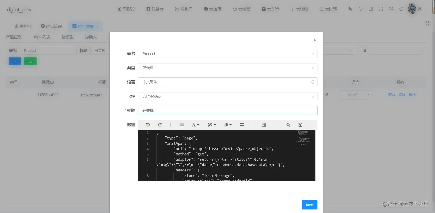 #### 4.点击设计编辑低代码,先编辑成产品的低代码用以添加平台的key与上传设备的key进行关联,如下图。