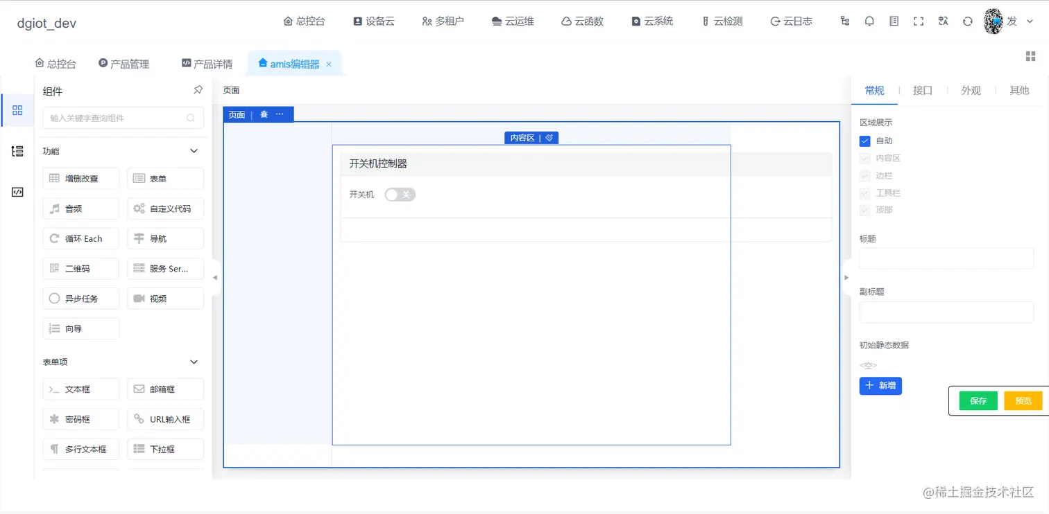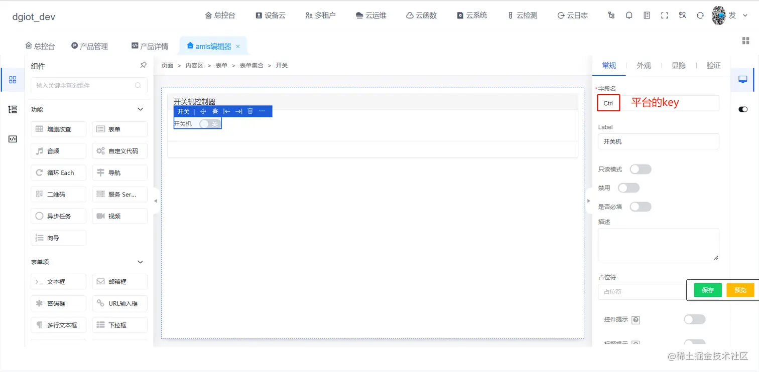 #### 5.在产品详情的可视化中找到刚刚创建的低代码,点击预览,点击一下开关机添加平台key,如下图。