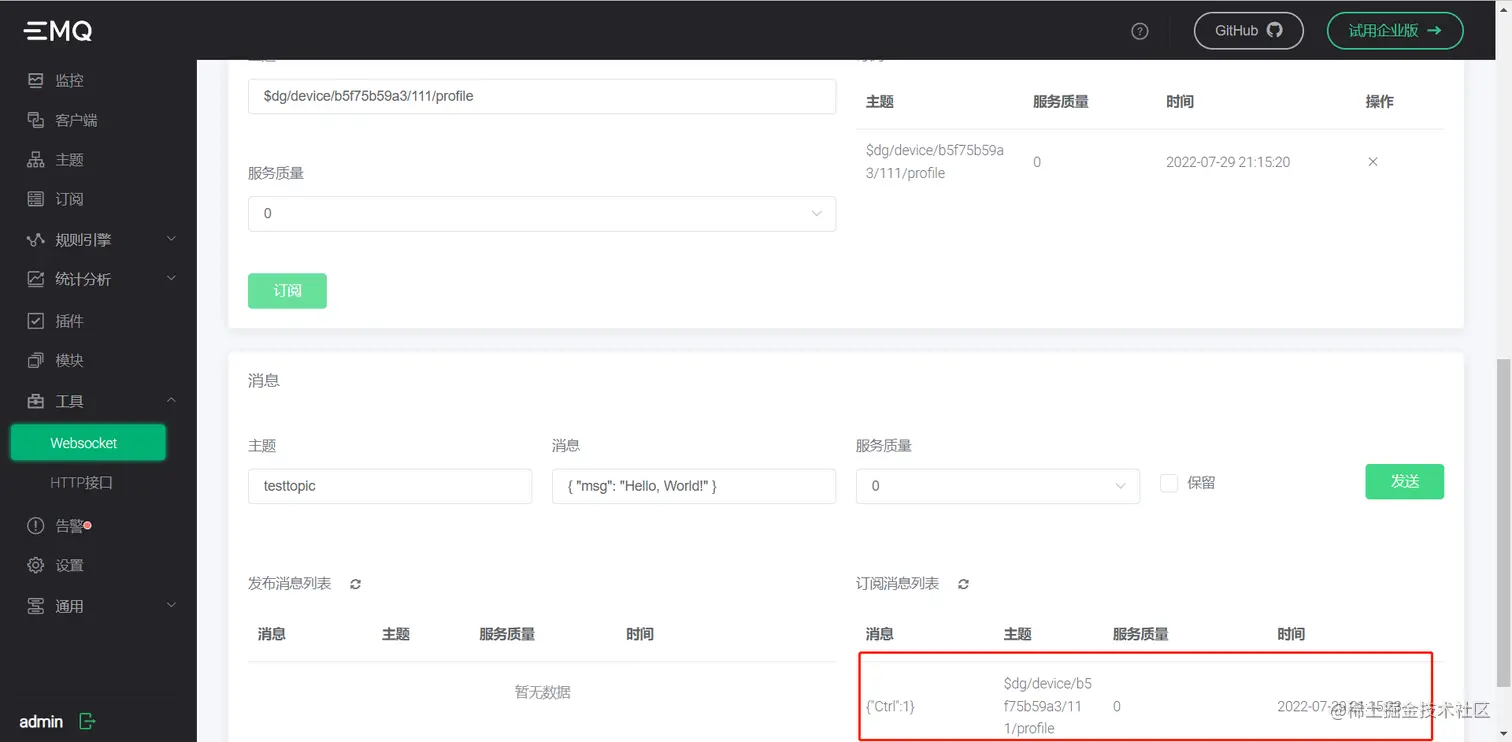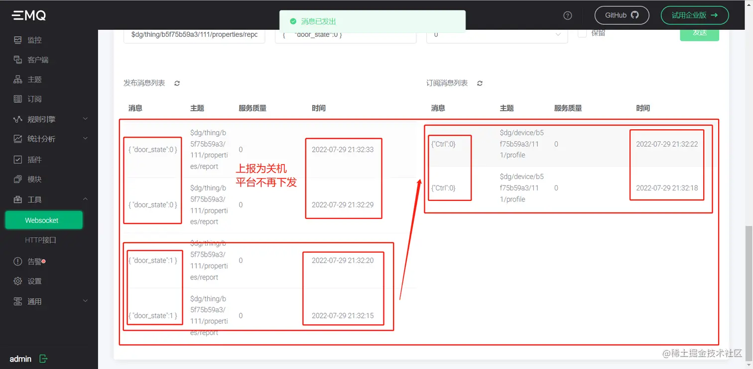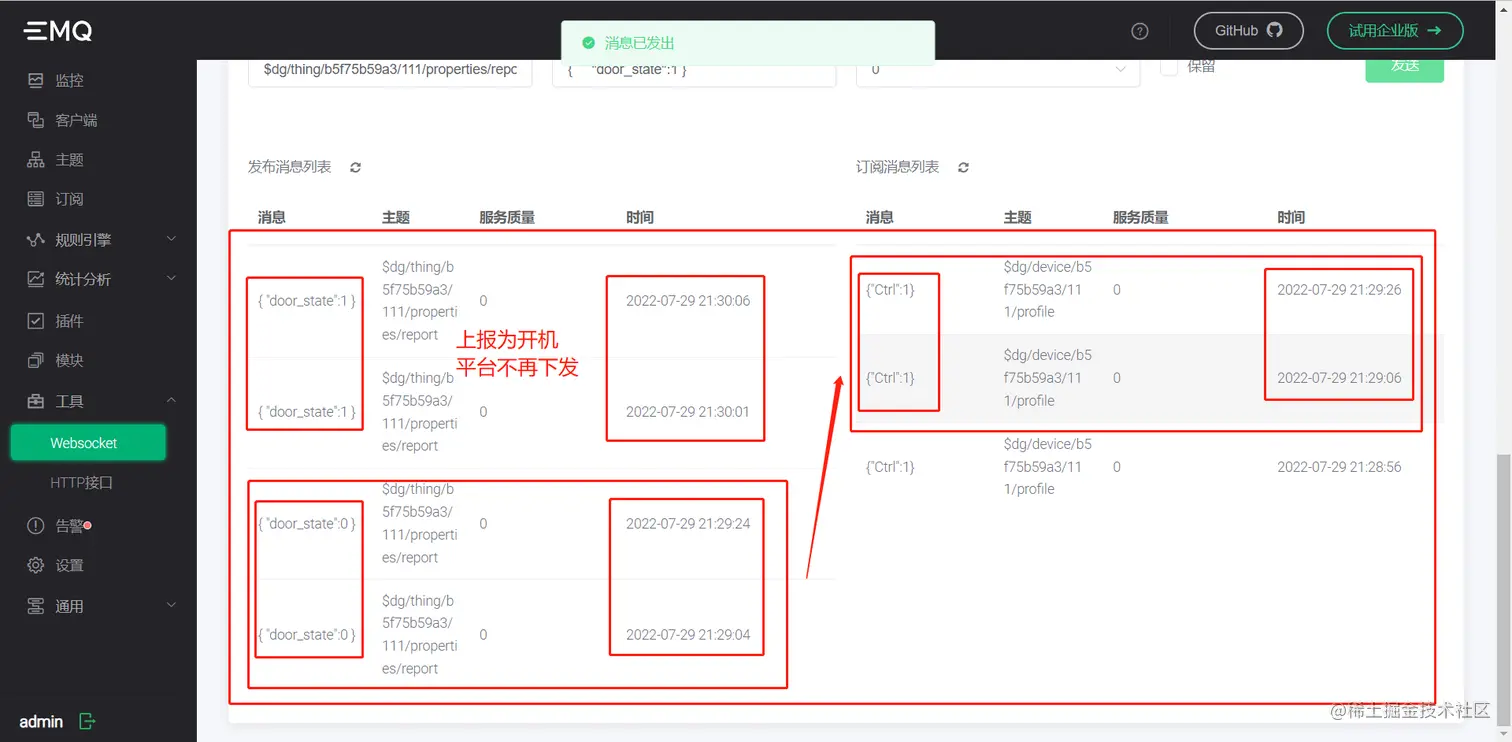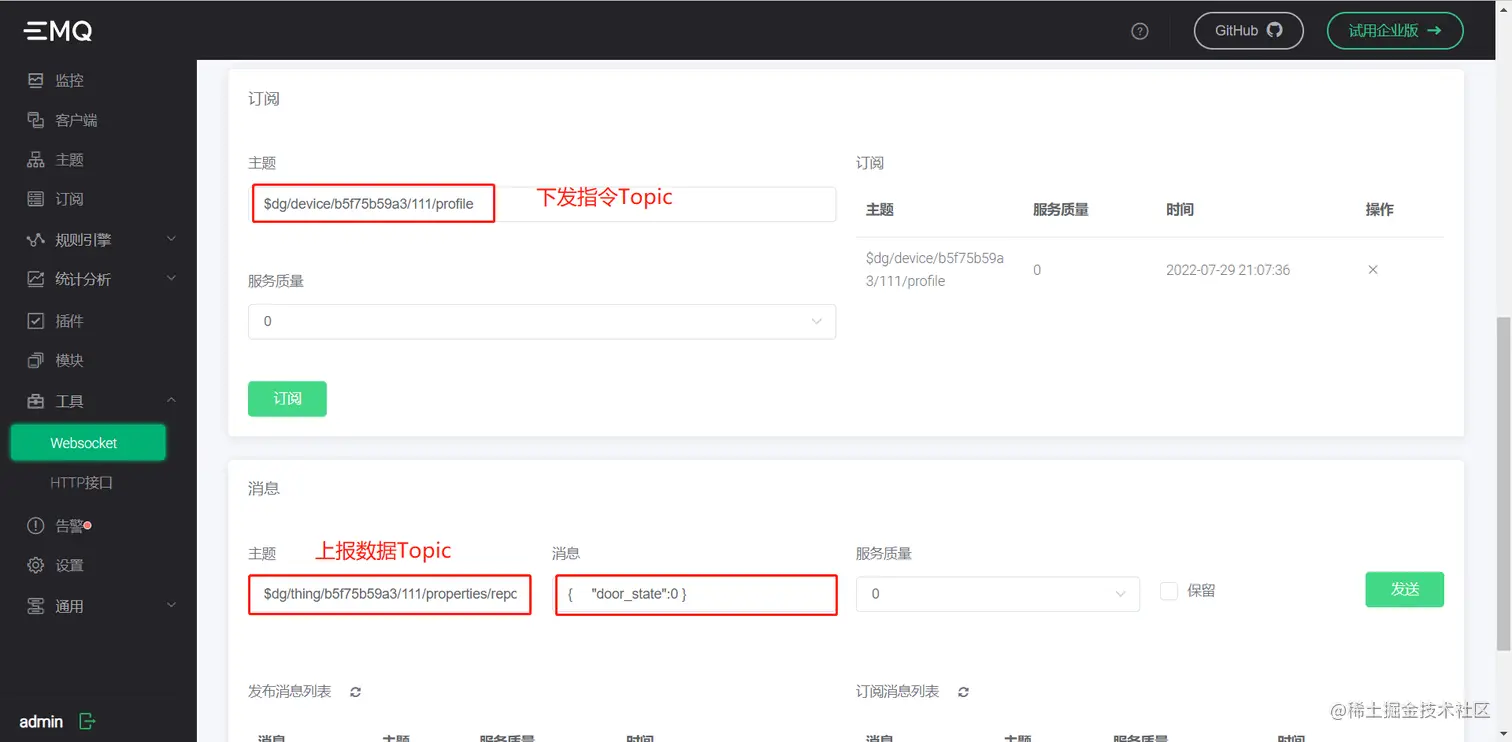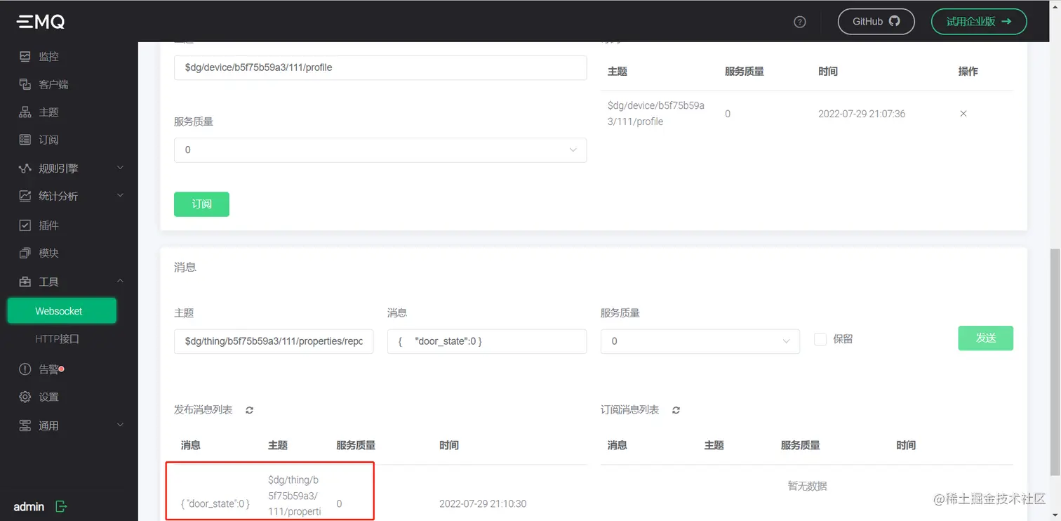 #### 9.设备数据模拟上报,方式一:MQTTX上报;方式二:ip:18083上报