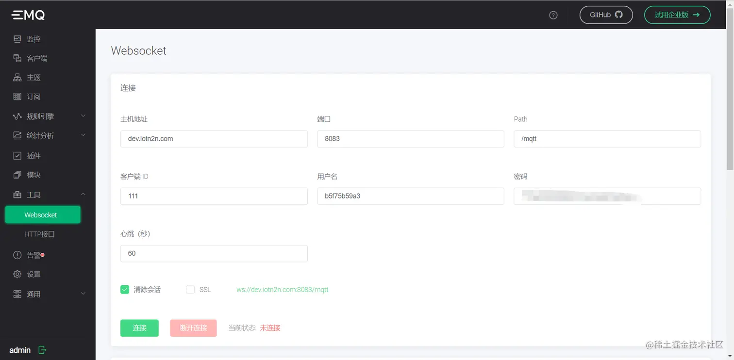 #### 8.设备模拟登录,方式一:MQTTX登录;方式二:ip:18083登录,用户名:admin,密码:public