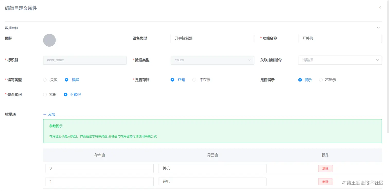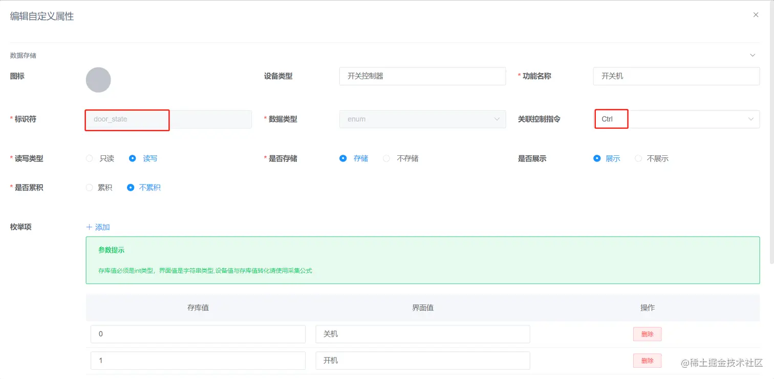 #### 2.在产品详情的物模型中创建设备上传的"key":"value"对应的物模型,如下图为例。