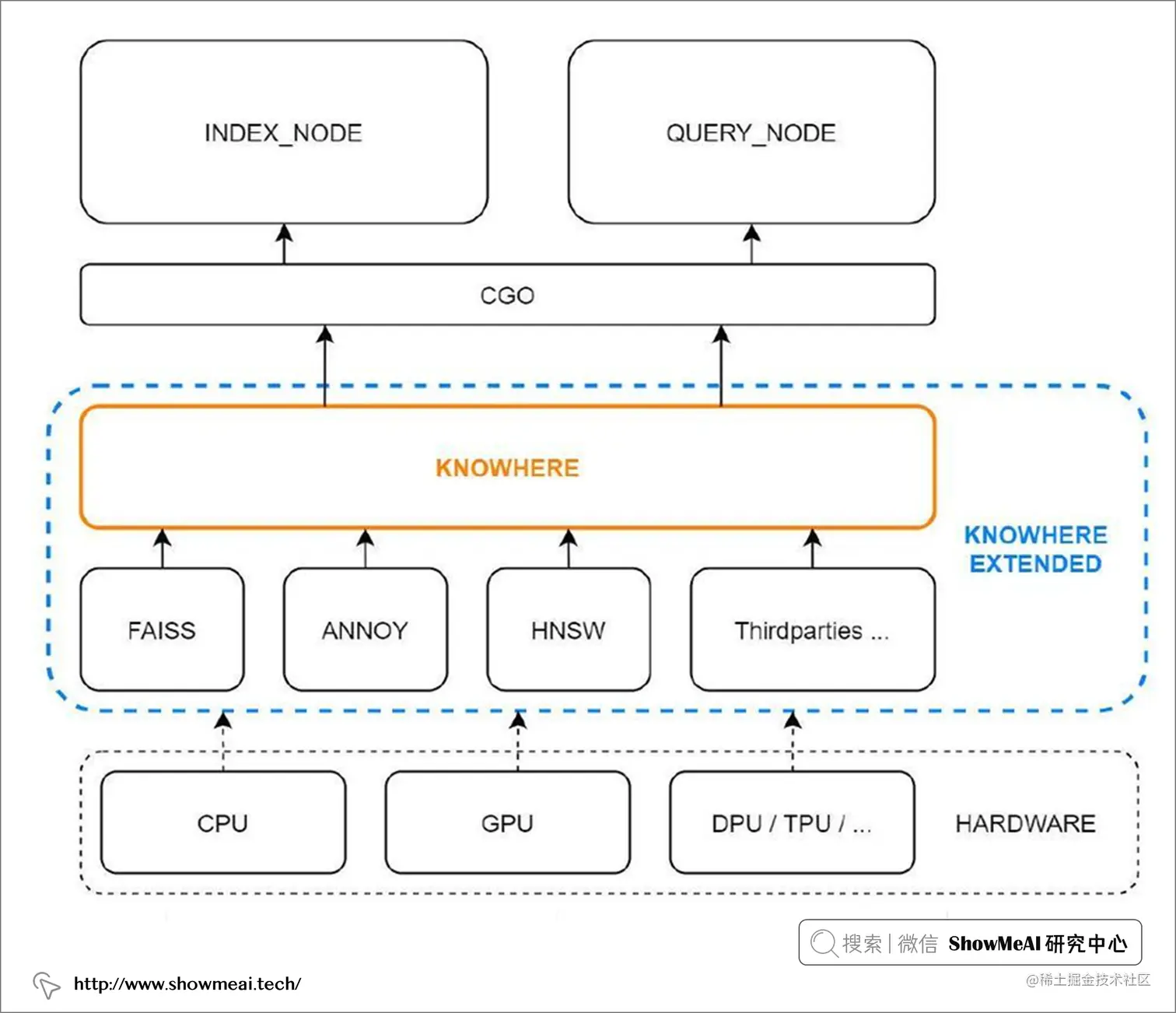 - 上方Knowhere 通过 CGO 与顶部的索引节点和查询节点进行交互