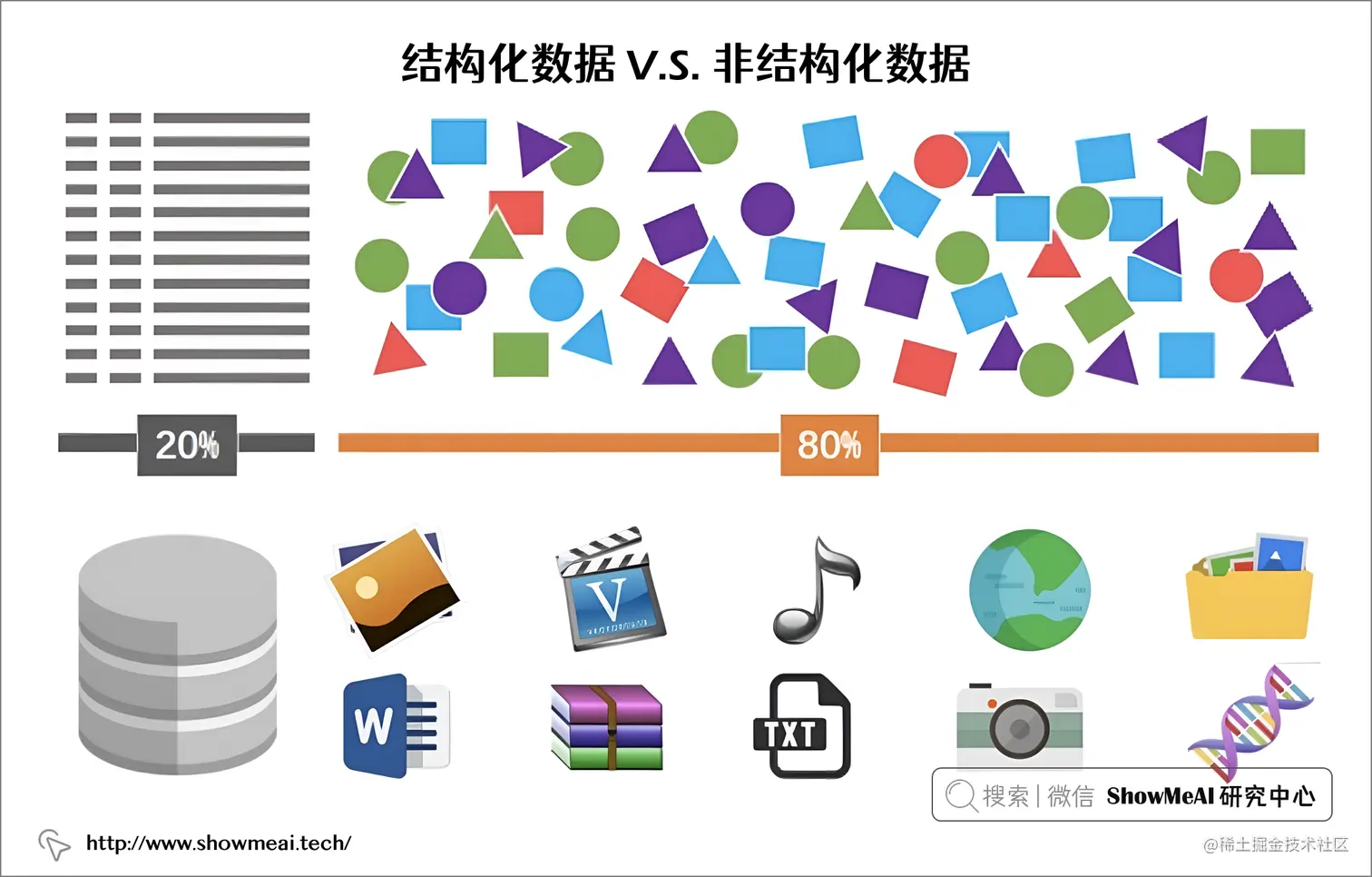 超过 80-90% 的数据是非结构化信息,例如文本、视频、音频、Web 服务器日志、社交媒体等