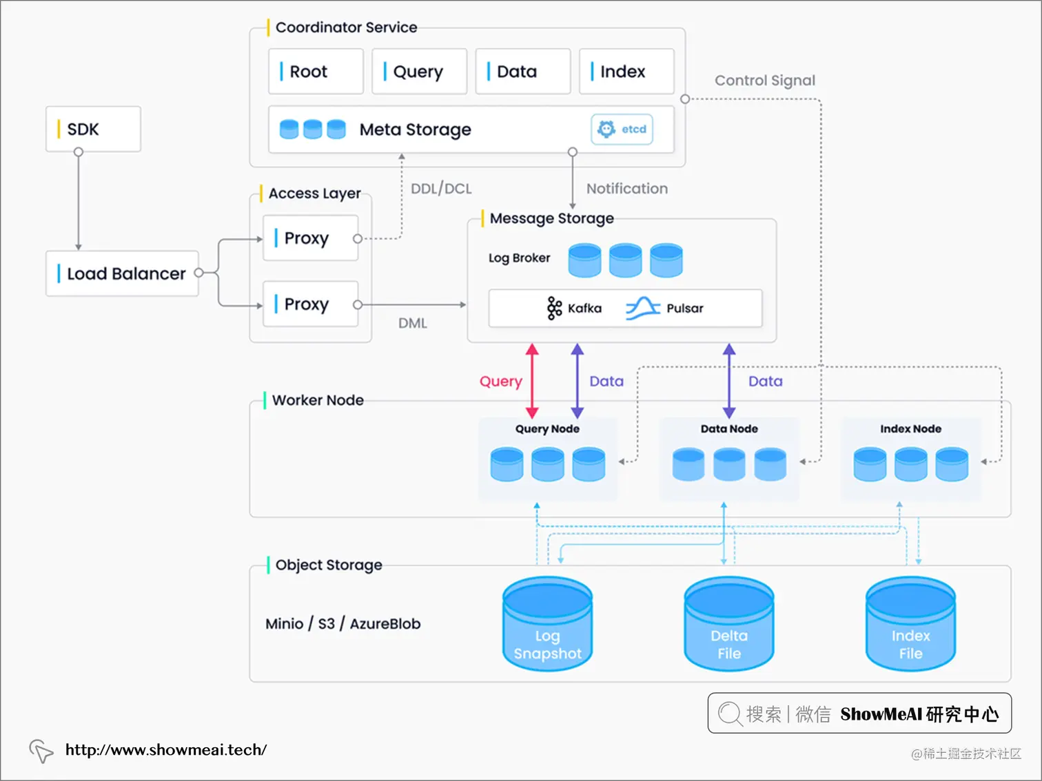 - 存储: 这是 Milvus 的基石,负责数据的持久化。存储层由元存储、日志代理和对象存储构成。
