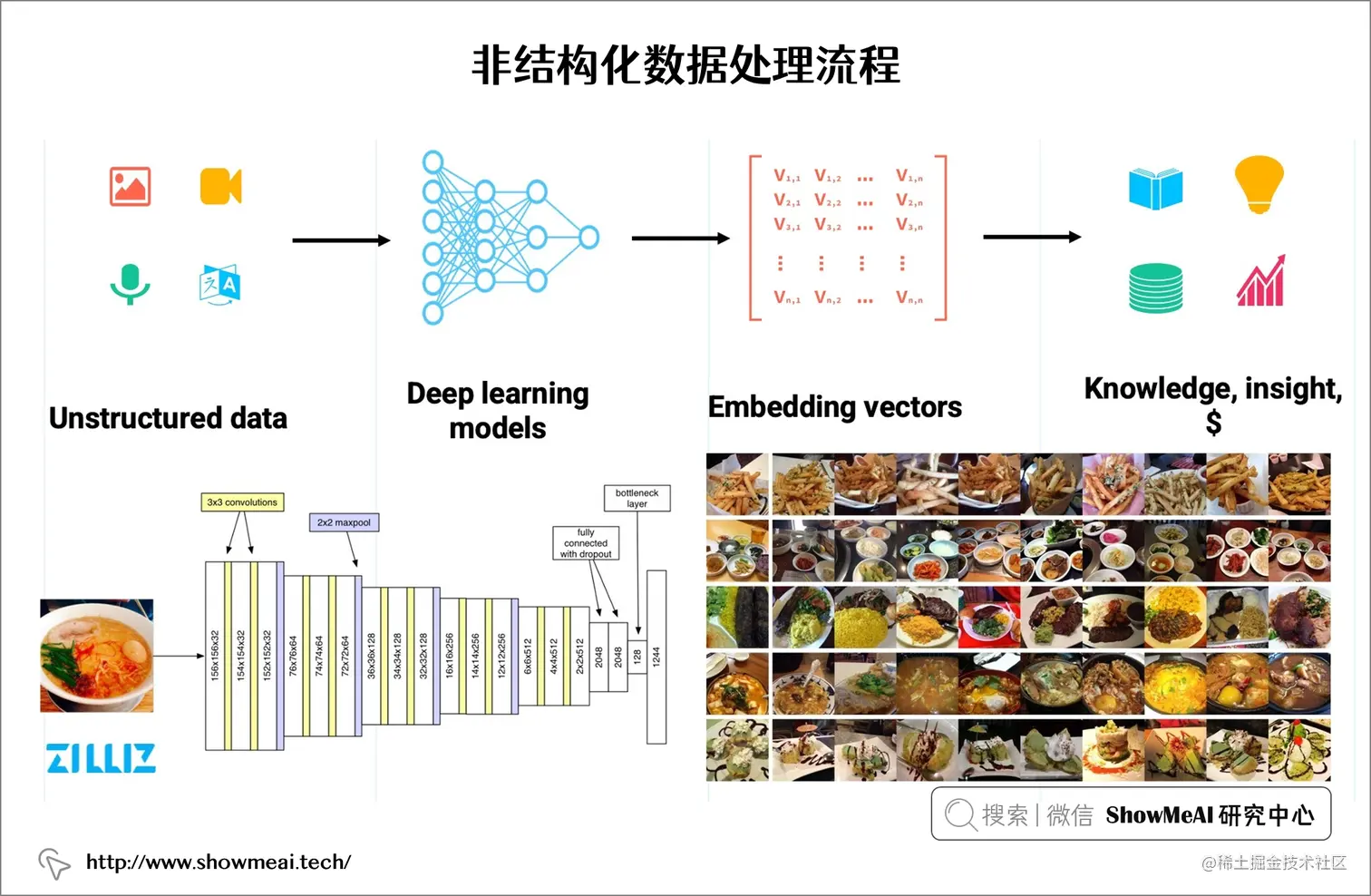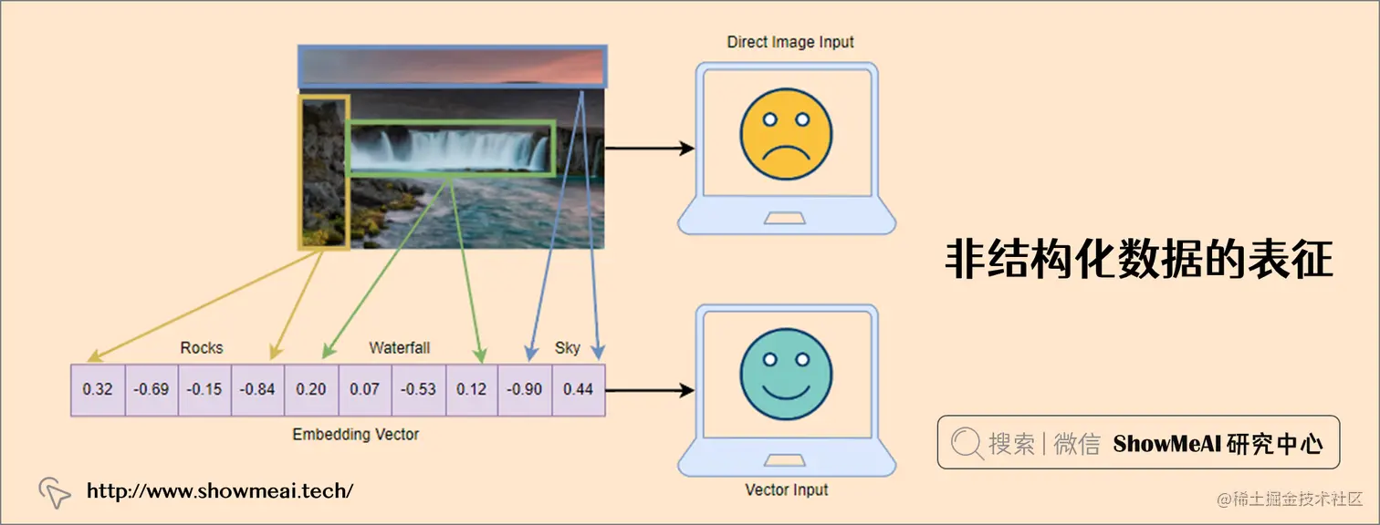 为了让计算机理解、处理和表征非结构化数据,我们通常将它们转换为密集向量,通常称为嵌入。如上图所示。