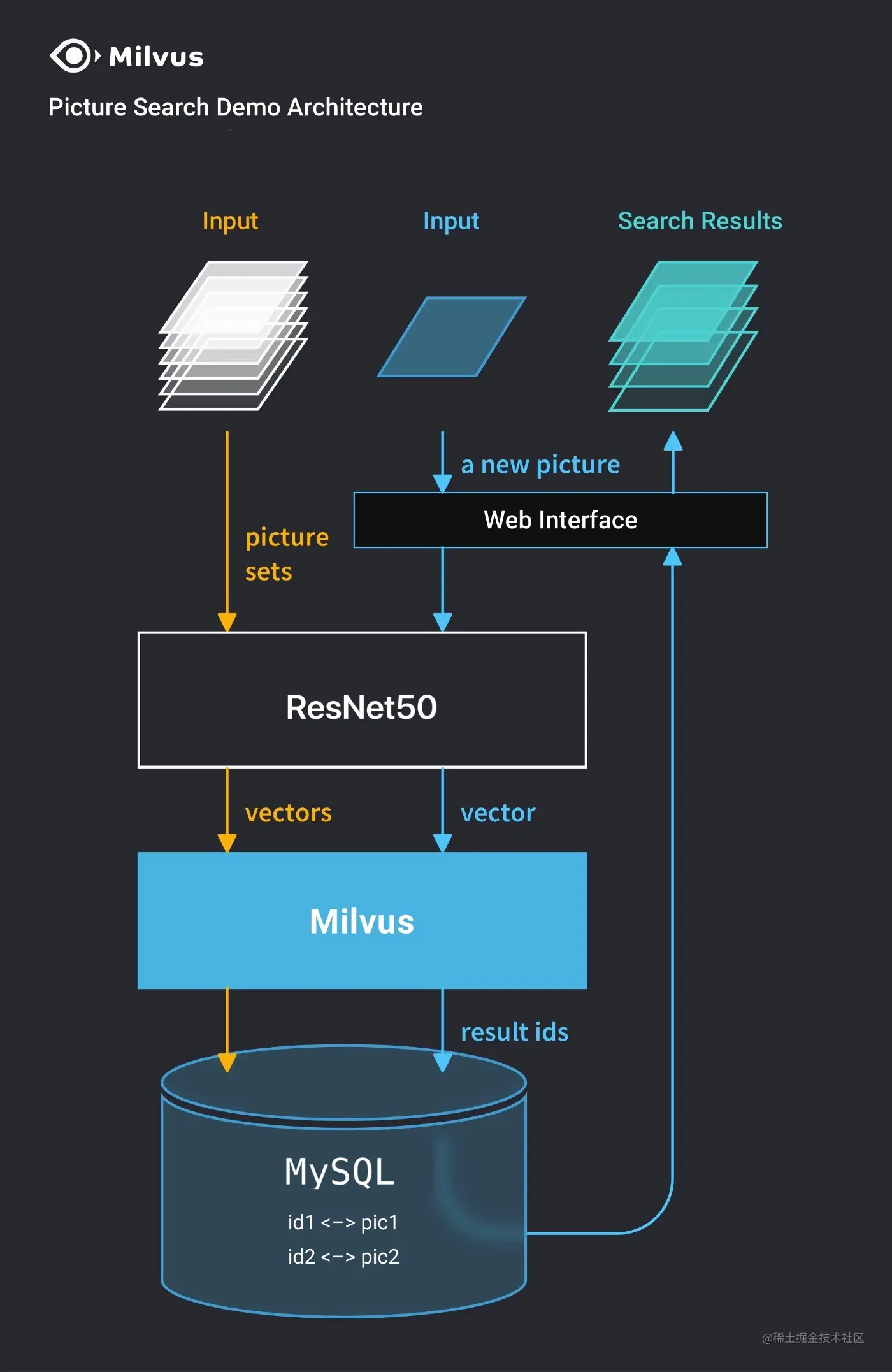 数据处理流程部分可以结合开源框架 towhee ,它利用像 ResNet-50 这样的预训练 CNN 模型,从图像中提取表征向量,再基于 Milvus 存储和索引这些向量,并将图像 ID 映射到 MySQL 数据库中的实际图片。Milvus 构建完索引后,可以轻松根据上传的新图像,进行大规模图像搜索。
