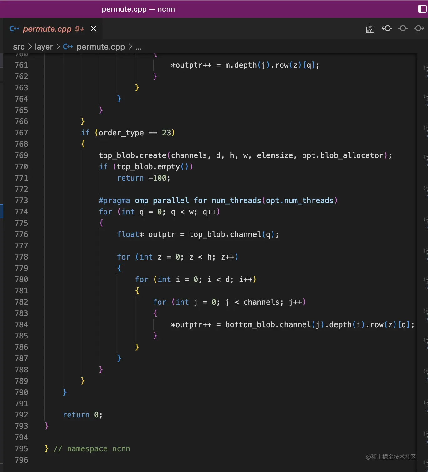 我们以permute这个层为例,ncnn里面的实现大概有739行代码: