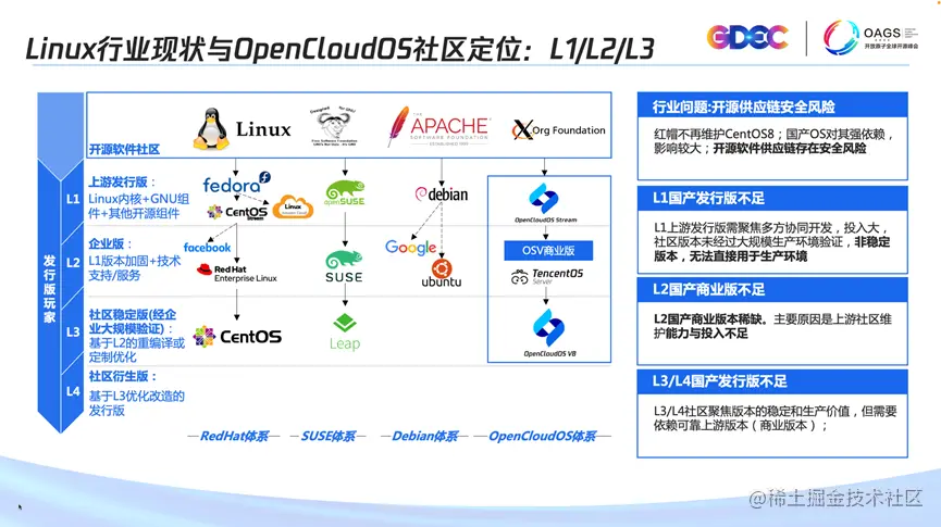 但L1上游发行版的研发投入巨大,并且需要多方协同开发,国产L1上游发行版的数量屈指可数。同样,L2级别的国产企业版也较少,大部分都属于L3/L4级别,这也是国产操作系统亟待解决的关键问题。
