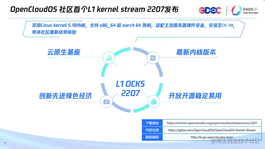 据腾讯OpenCloudOS社区TOC主席、腾讯云副总裁、腾讯蓬莱实验室负责人郭振宇介绍,作为OpenCloudOS L1源社区的核心组件,OCKS 2207源自最新稳定版本Linux Kernel 5.18,支持x86、AArch64架构,适配主流服务器硬件设备,可以提供最新的硬件平台功能特性支持。