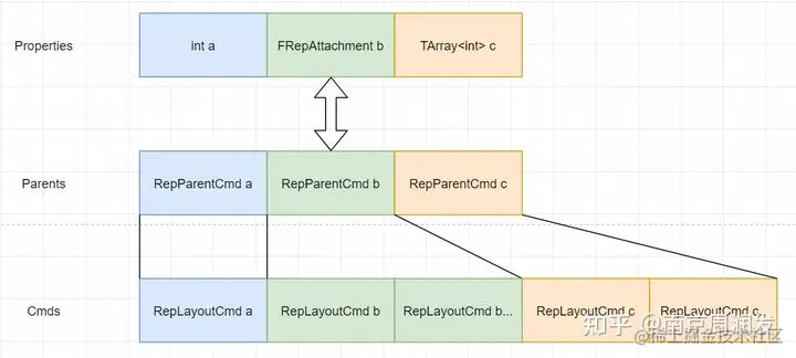 FProperty,要设置它们的 RepIndex 值,与 ENetFields 对应。之后初始化 Class 的 ClassReps 属性,其中存储了从基类到当前类的所有要同步 Property 和它们的 ArrayIndex,后者一般都为 0。 - 之后对于 ClassReps 中每一个 Property,要在 Parents 中添加一条 RepParentCmd 记录,并记下下标 ParentHandle。然后根据 Property 类型,向 Cmds 数组添加 Cmd 实例, ArrayProperty 和 StructProperty 需要特殊处理,添加多个子 Cmd,其余普通属性则直接向 Cmds 数组添加一个 Cmd 实例即可。添加的第一个子 Cmd 下标设置为