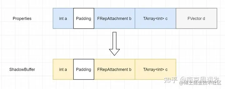 类的属性中,只有 a,b,c 需要创建 ShadowBuffer,d 因为不同步,因此不需要加入 ShadowBuffer。然后由于内存对齐需要(实际 8 byte 对齐),a 属性后面有 4 byte 填充,这也会反应到 ShadowBuffer 中。乍看之下,属性同步还是会多使用不少内存空间的。