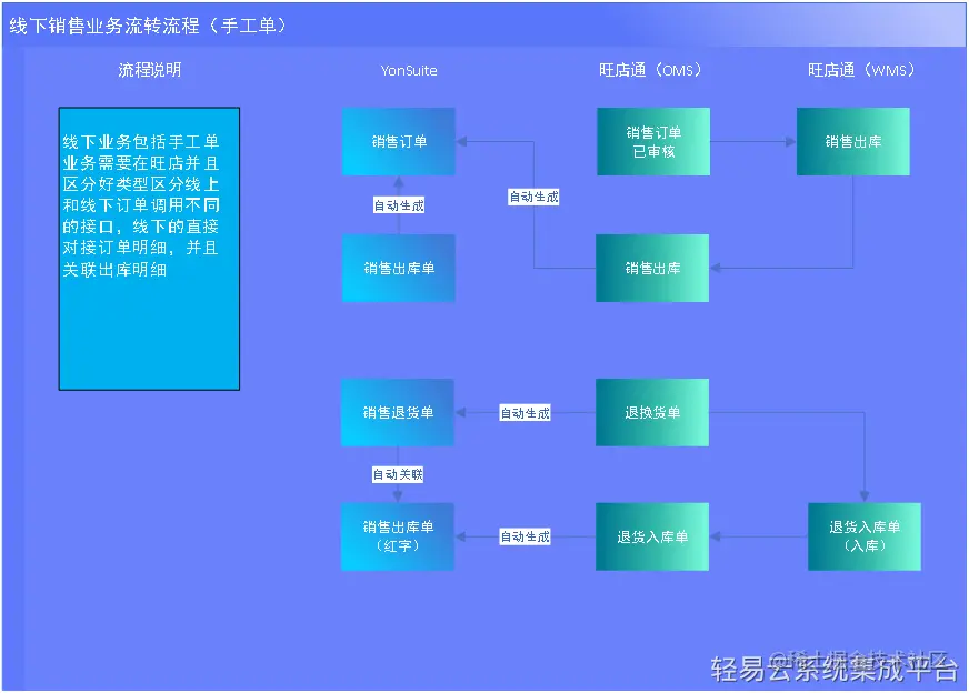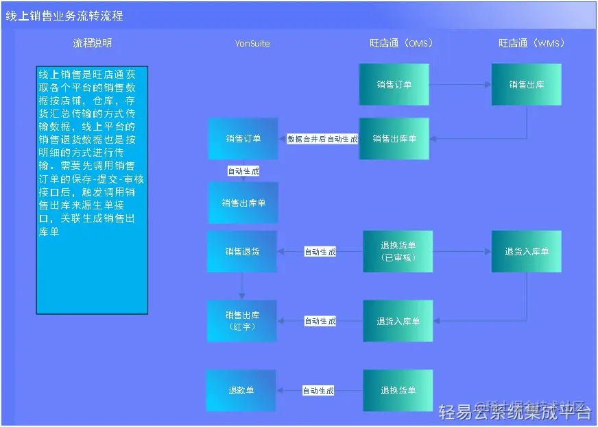 - 销售业务统一在旺店通OMS发起并且对接到YS中生成对应的销售订单/销售出库单