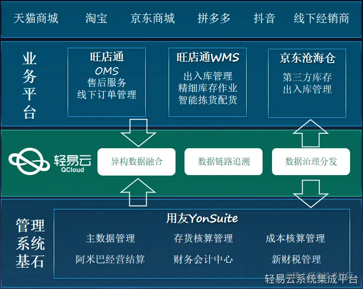 旺店通企业版结合旺店通WMS以及其他品牌的WMS(京东沧海)进行电商业务的管理,线下使用的是用友YonSuite系统进行财务和业务的核算系统,全部业务数据将汇集到用友YonSuite系统,现在需要将三套系统的相关数据进行对接打通,实现所有业务的数据可以打通,并且保证电商业务的库存和财务核算系统的数据准确。