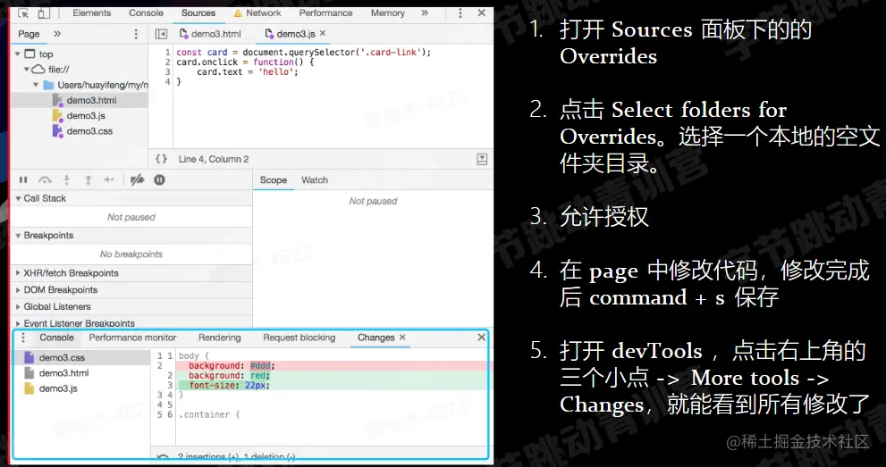 我们平时在 Source 面板在线修改调试代码,会实时更新效果,但浏览器一刷新之前修改的全部恢复原样,这样子调试代码效率就很低,只能浏览器调试改点,代码跟着改点很麻烦。为了解决这个问题,我们可以使用 Overrides 保存线上修改后的文件,并能清晰看出改动了哪些地方,最后修改代码也方便。