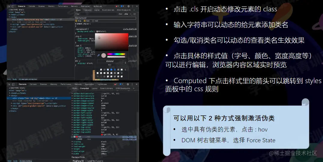 网页对应的元素、页面dom元素,可修改元素样式,可修改想要调试的样式和类名