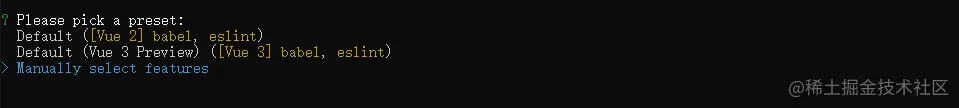 - 新建空白目录,打开终端输入 vue create '你的项目名' 回车创建