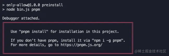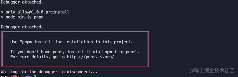 可以看到它会提示我们需要使用 pnpm进行安装并且退出当前进程。