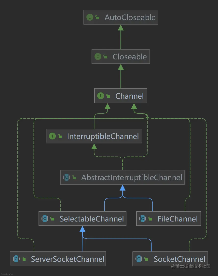 SelectableChannel 类和 FileChannel 类是平级关系,都是继承自父类 AbstractInterruptibleChannel。抽象类 SelectableChannel 有很多子类,这里只展示了在 Socket 编程中常用的 ServerSocketChannel 和 SocketChannel, 如下图: