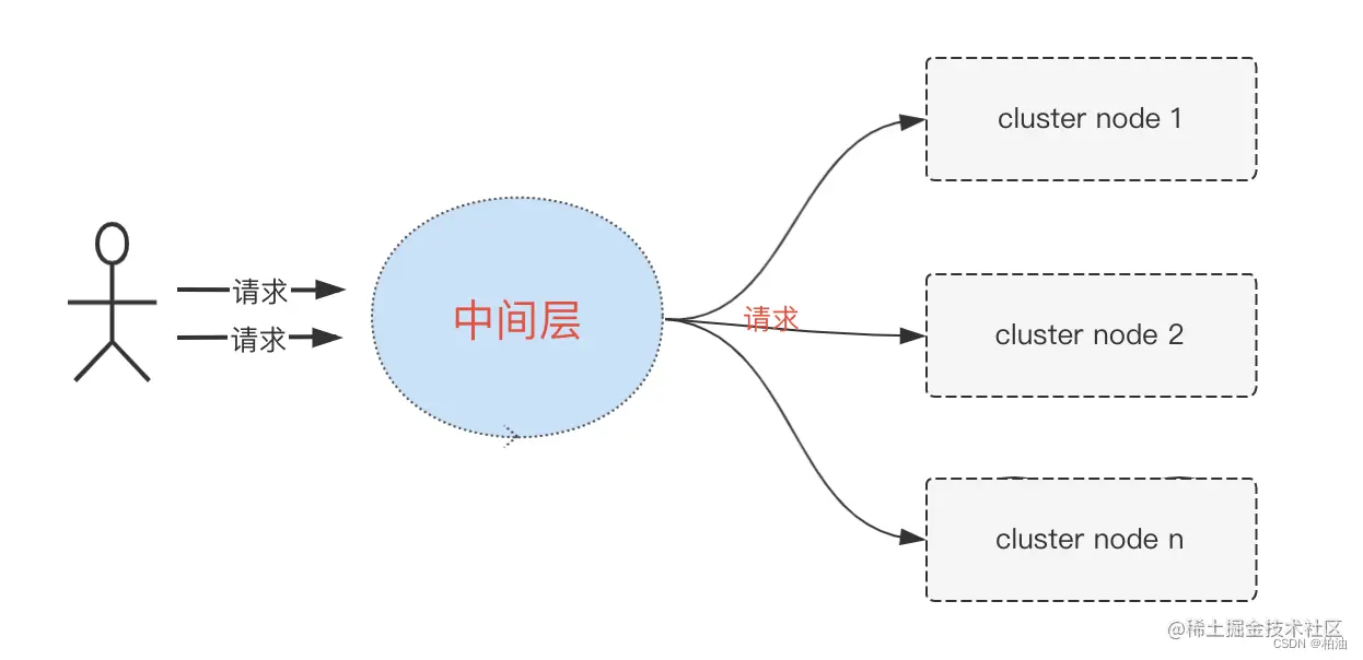 对于分布式服务的元数据信息管理,我们要么采用中心化的方式,请求直达中间层,然后采用常见的中间组件来存储元数据,比如 zk、etcd 等等;在用户端看来,就像是单节点一样,我画了张图,你可以参考下: