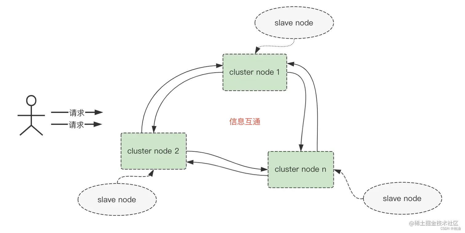 另外,也可以考虑使用去中心化的方式,让每个节点都维护一份元数据信息,集群间可以采用特定的一些通信协议进行信息交换,然后客户端请求直连集群任意节点,我也画了张图,大概是这样: