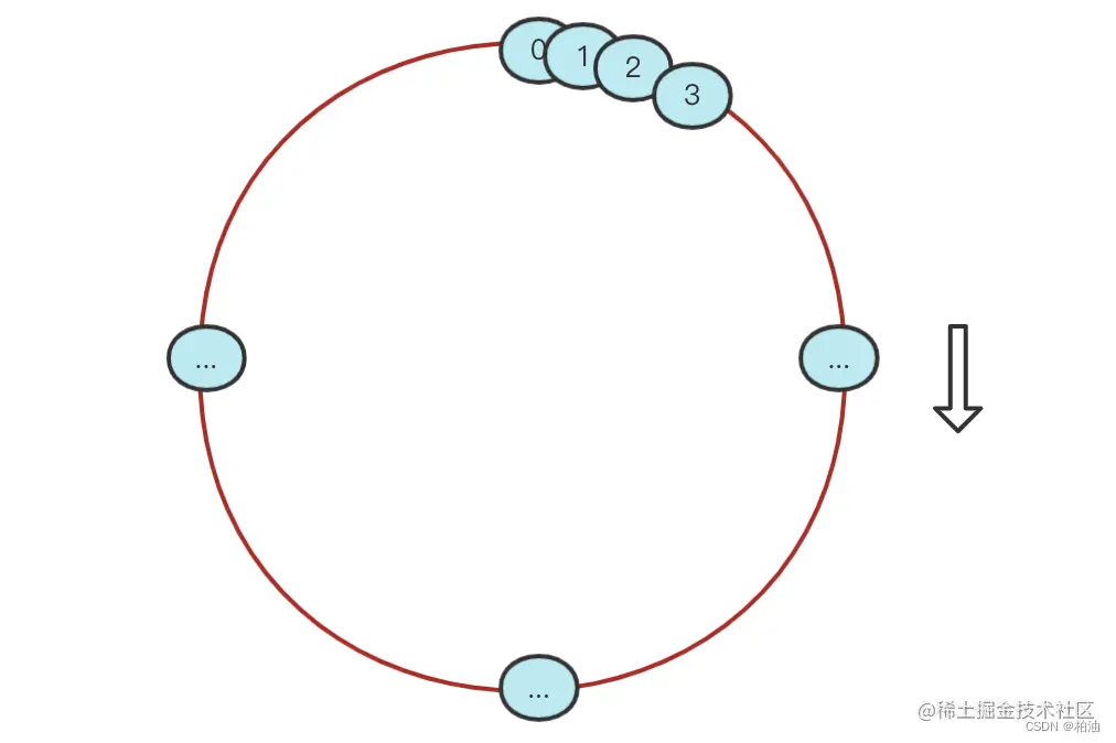要想 hash 值 (hash(key) % d)不变,只有一个办法,维持模 d 不变。一致性哈希采用定长模 = 2^31 -1,然后我们将这些点(槽)映射到一张环形网中,每一个槽对应一类哈希值: