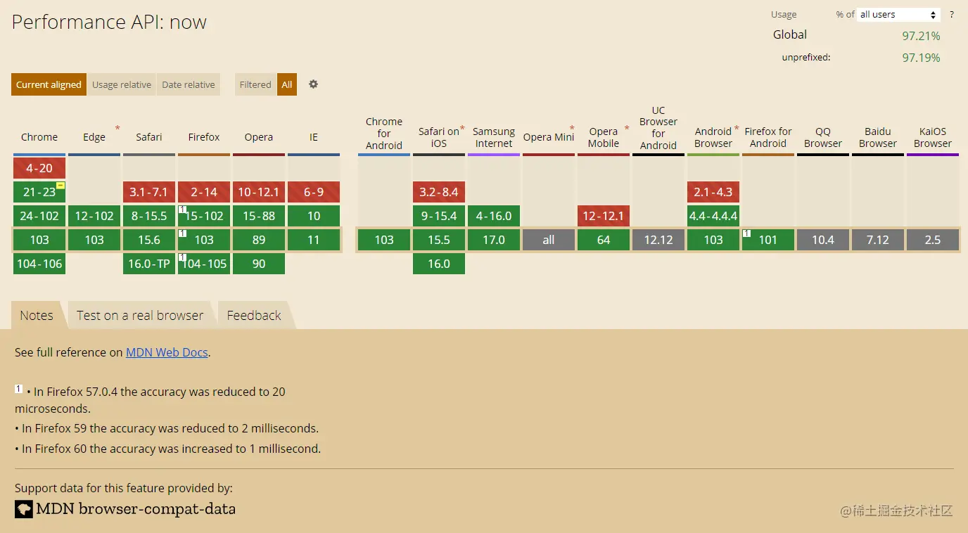 performance上的now()方法返回的是当前时刻的高精时间戳,也就是相对performace.timeOrigin之后经过的时间。