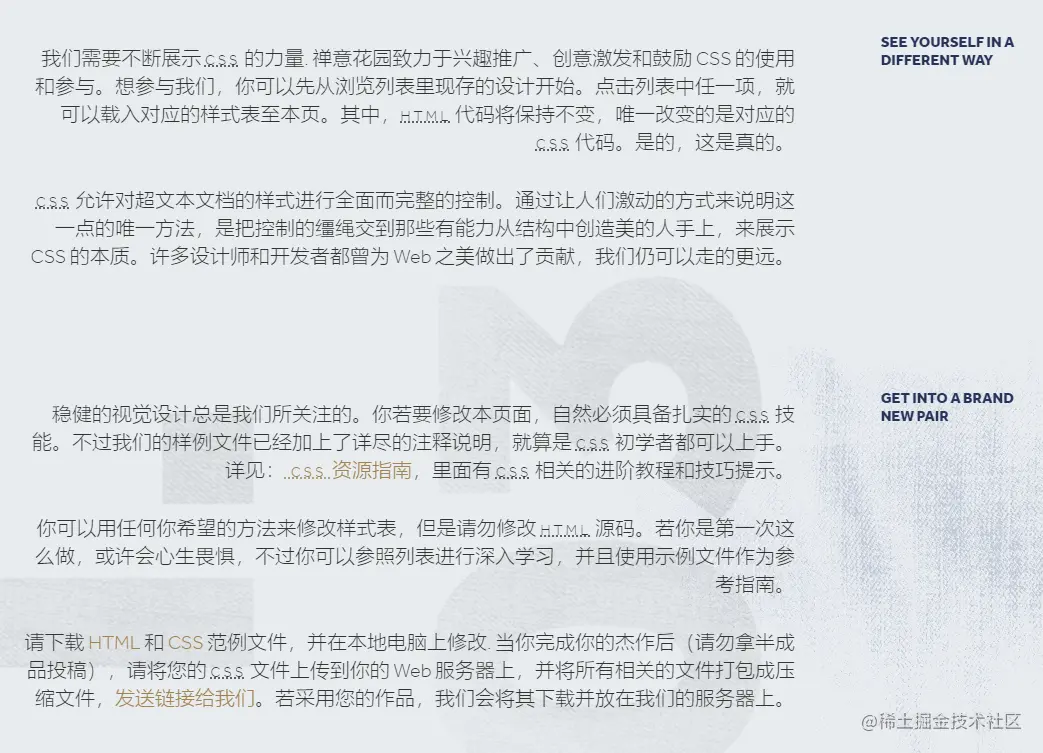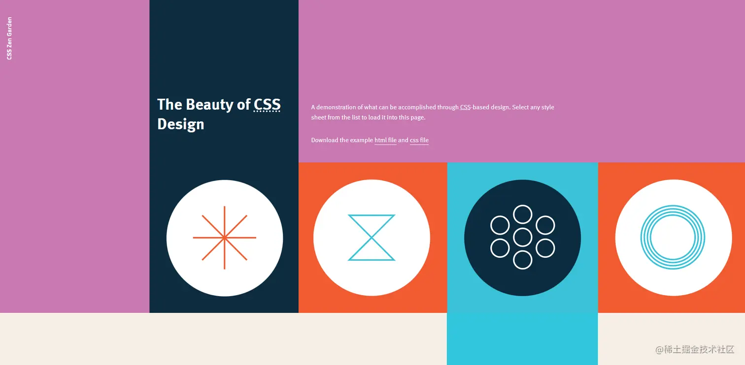 当然,准确地来说,是它们共同使用了同一个HTML文件,拥有着相同的DOM结构,但是通过CSS,他们呈现了截然不同的样貌,有的清新婉约、有的雍容华贵、有的淡雅秀丽、有的热情奔放,这就是CSS的魅力,这就是禅境花园。