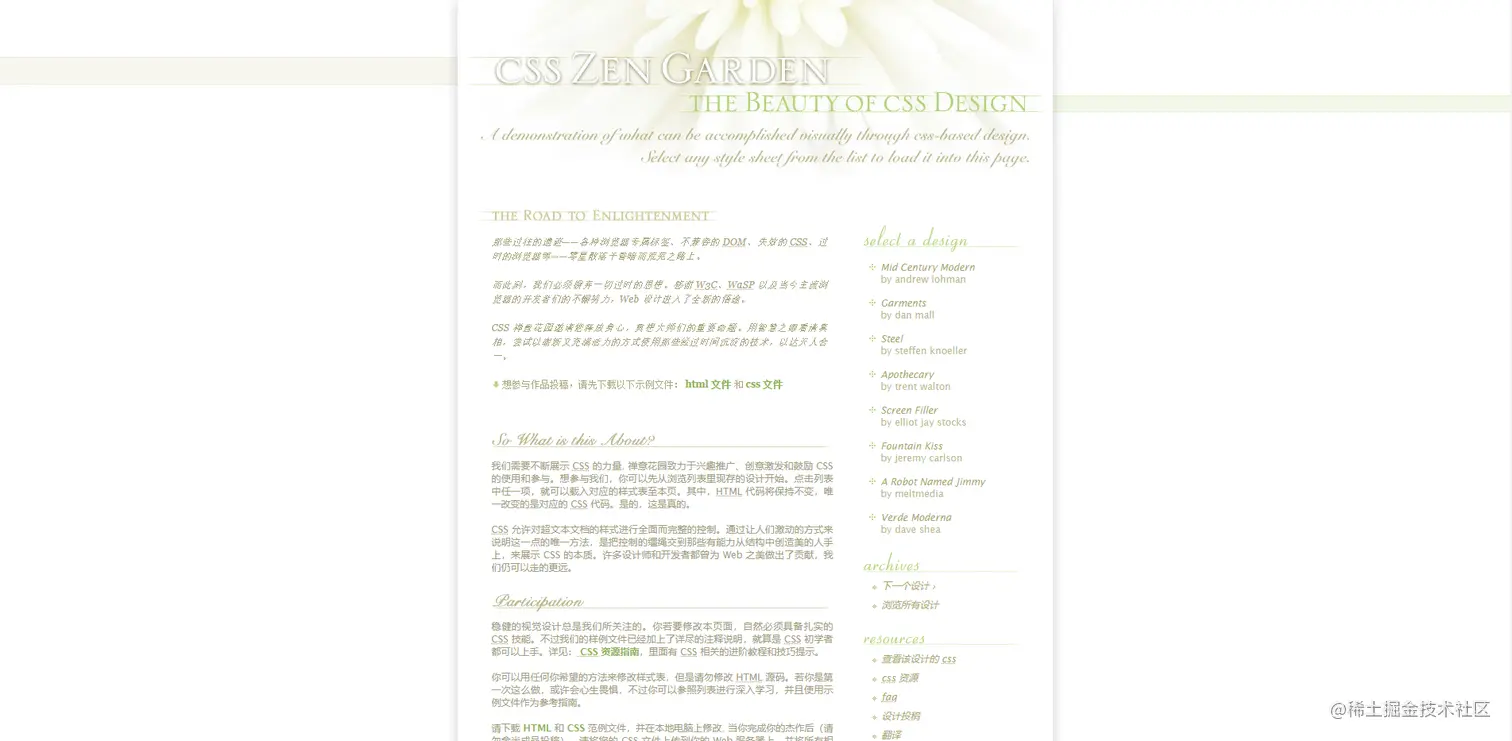 然而在我一开始学习前端的时候,觉得CSS不过如此——无非就是改一改颜色,换一换位置而已,然而,在偶然的机遇下,看到了CSS禅境花园,让我真正领略了CSS的魔力。