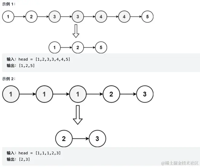 指针 cur 指向链表的哑节点,随后开始对链表进行遍历。如果当前 cur.next 与 cur.next.next 对应的元素相同,那么我们就需要将 cur.next 以及所有后面拥有相同元素值的链表节点全部删除。我们记下这个元素值 x,随后不断将 cur.next 从链表中移除,直到 cur.next 为空节点或者其元素值不等于 x 为止。此时,我们将链表中所有元素值为 x 的节点全部删除。