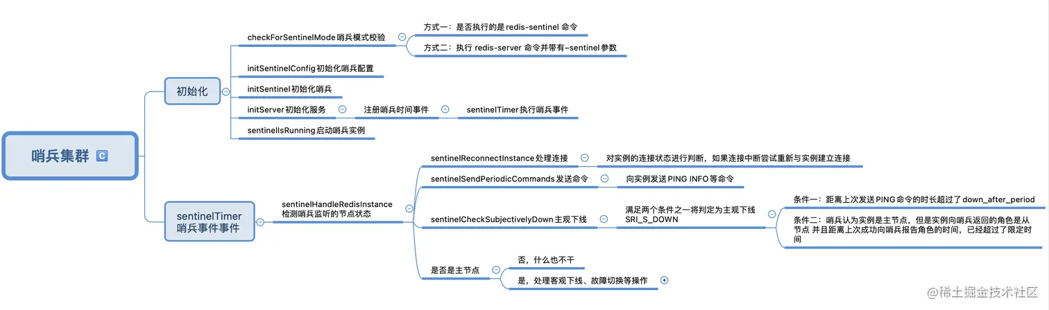 在的redis启动函数main(server.c文件)中,对哨兵模式进行了检查,如果是哨兵模式,将调用initSentinelConfig和initSentinel进行初始化,initServer函数中会注册哨兵的时间事件,最后调用sentinelIsRunning运行哨兵实例,