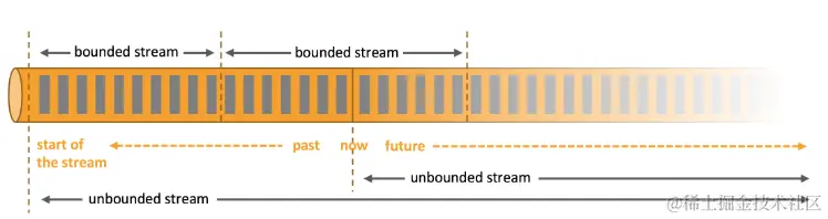 所有的数据都是以流式的形态产生的,不管是哪里产生的数据,在产生的过程中都是一条条地生成,最后经过了存储和转换处理,形成了各种类型的数据集。如下图所示,根据现实的数据产生方式和数据产生是否含有边界(具有起始点和终止点)角度,将数据分为两种类型的数据集,一种是有界数据集,另外一种是无界数据集。>
