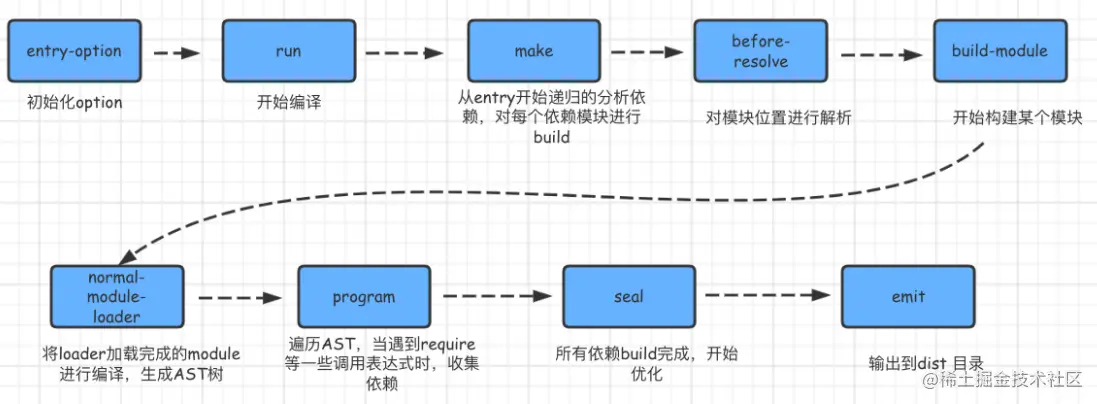 Shell语句中读取与合并参数,并初始化需要使用的插件和配置插件等执行环境所需要的参数 - 编译构建流程:从 Entry 发出,针对每个 Module 串行调用对应的 Loader 去翻译文件内容,再找到该 Module 依赖的 Module,递归地进行编译处理