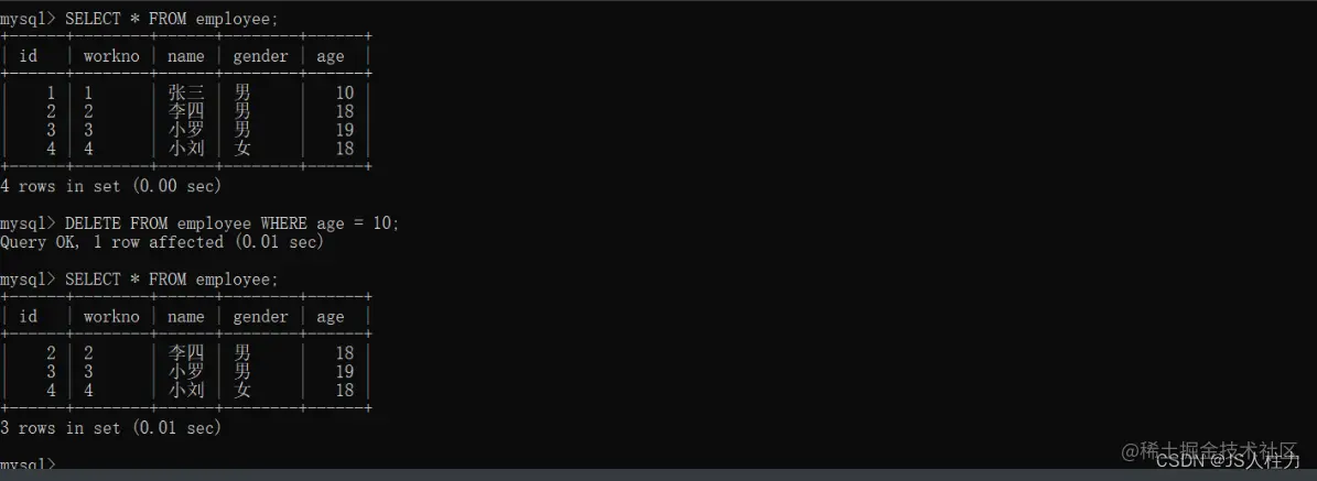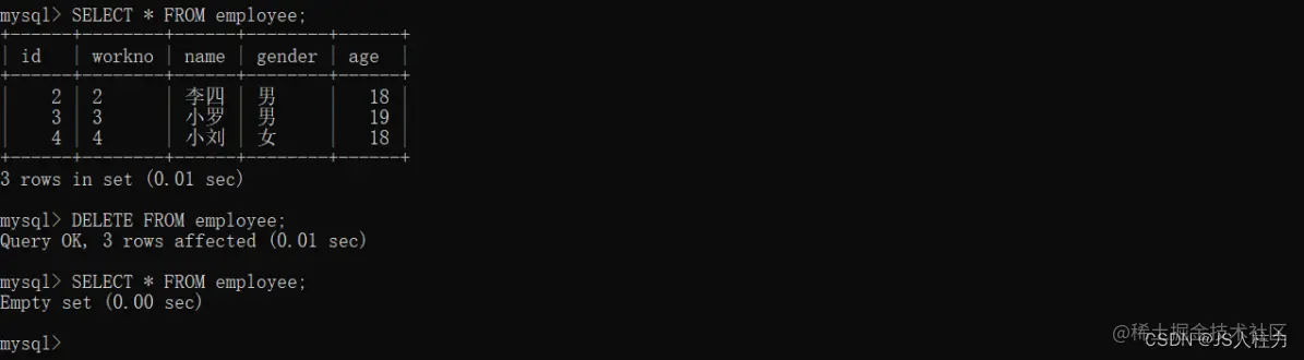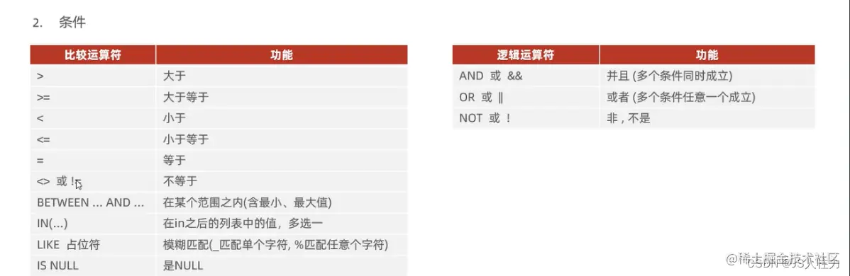 - DELETE语句的条件可以有,也可以没有,如果没有条件。则会删除整张表的所有数据。