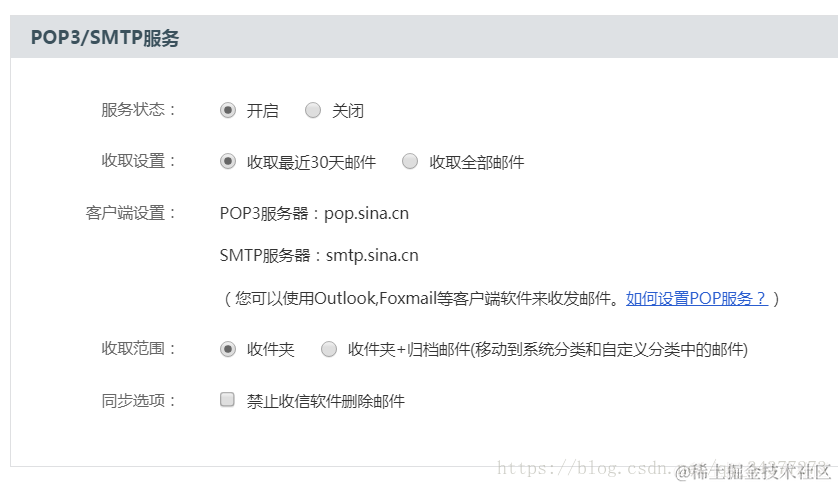首先需要登录新浪邮箱,打开服务器设置:全部选择开启状态