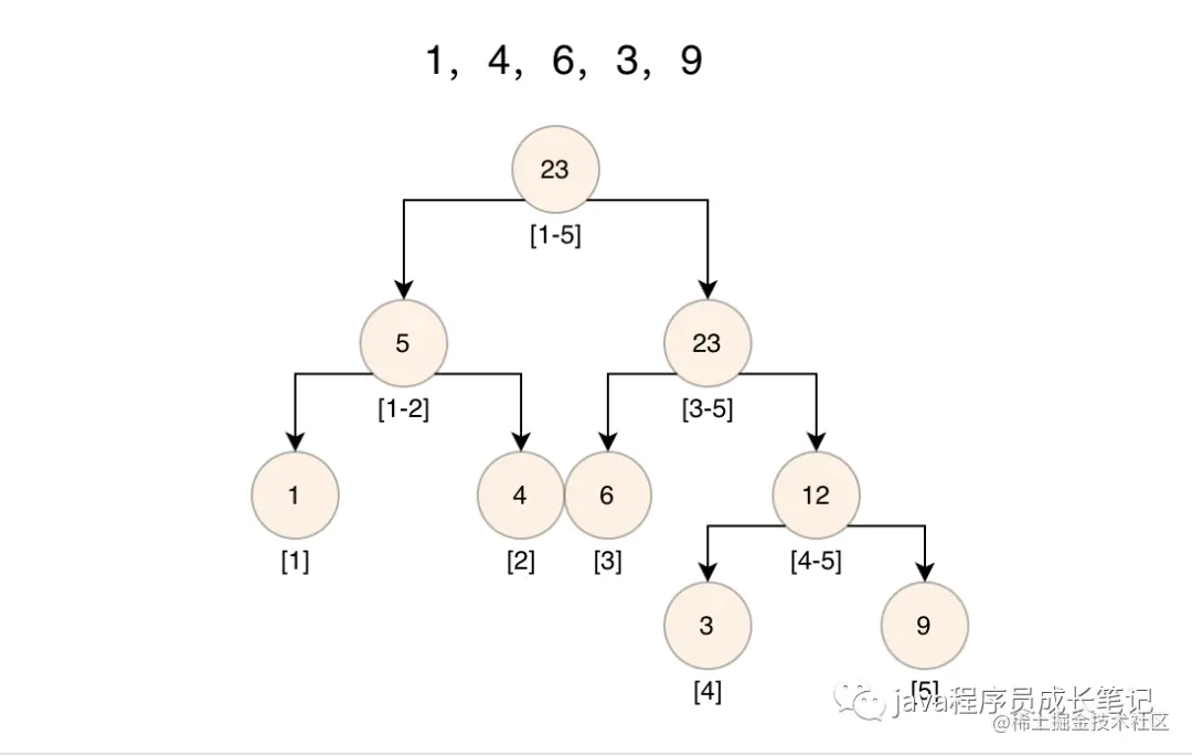 线段树是一种二叉搜索树,是用来维护区间信息的数据结构。可以在O(logN)的时间复杂度内实现单点修改、区间修改、区间查询(区间求和,求区间最大值,求区间最小值)等操作。接下来我以实现区间求和为例子来讲解线段树(最大值和最小值与求和实现方式几乎无异),假设存在一个数组[1,4,6,3,9]。