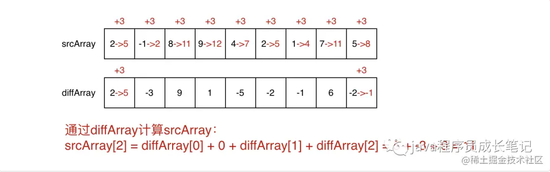 从上图中我们可以很清晰的看到,diffArray[1]=-3=srcArray[1]-srcArray[0]=-1-2,那么当我们在已知差分数组的情况下,如何推出原数组,同样依据上面的关系,但是我们需要从index=0,依次将当前差分数组与原数组的上一个值进行累加。