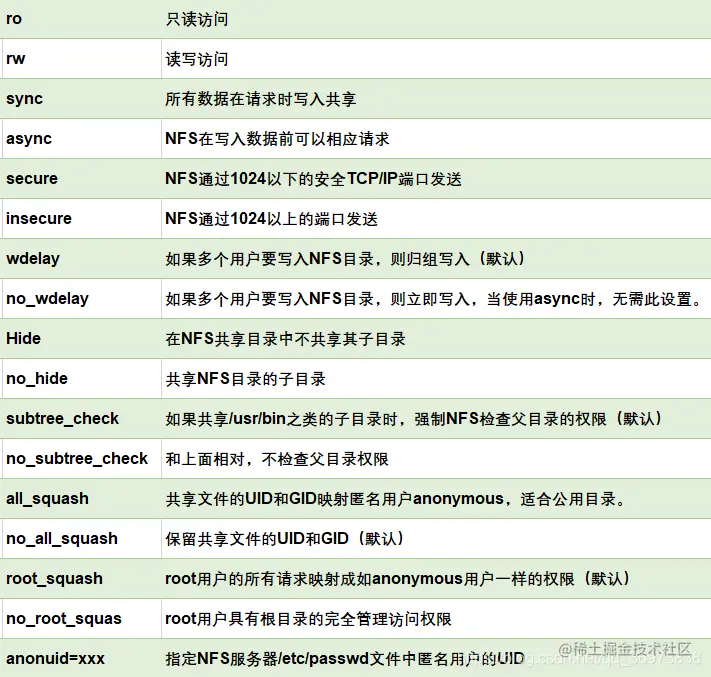 vim /etc/exports /nfs *(rw,sync,no_root_squash) 第一部分:/nfs 是服务器共享的目录 第二部分:* 允许访问的ip,*表示所有 例如192.168.0.0/24,其中的/24是掩码,此处表示24个1,即11111111.11111111.11111111.00000000, 即掩码是255.255.255.0。结合前面192.168.0.0表示此处配置IP为 192.168.0.*的主机均可以访问该目录,即局域网上的所有主机。 第三部分:(insecure,rw,sync,no_root_squash,no_subtree_check) -