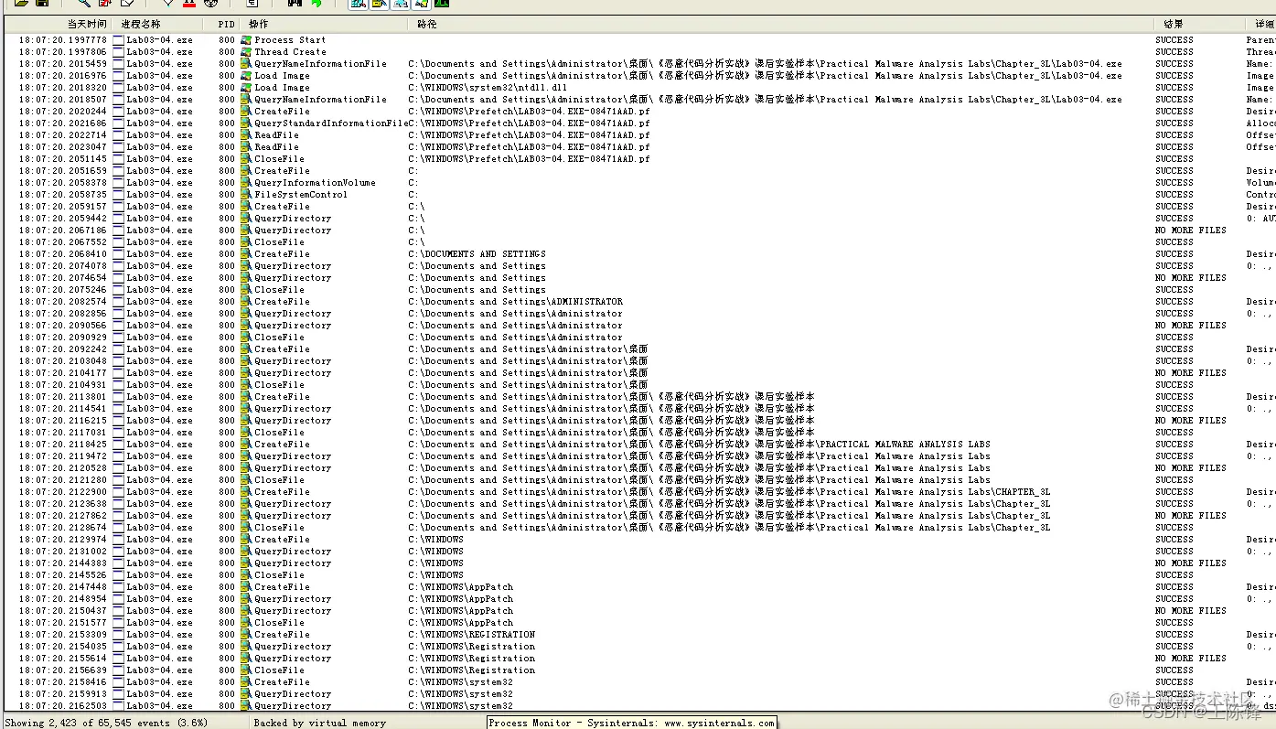 听说文件删除过程通过“C:\WINDOWS\system32\cmd.exe" /c del C:\TY\lab3\Lab03-04.exe >> NUL”完成,在Process Monitor中找到这个操作。